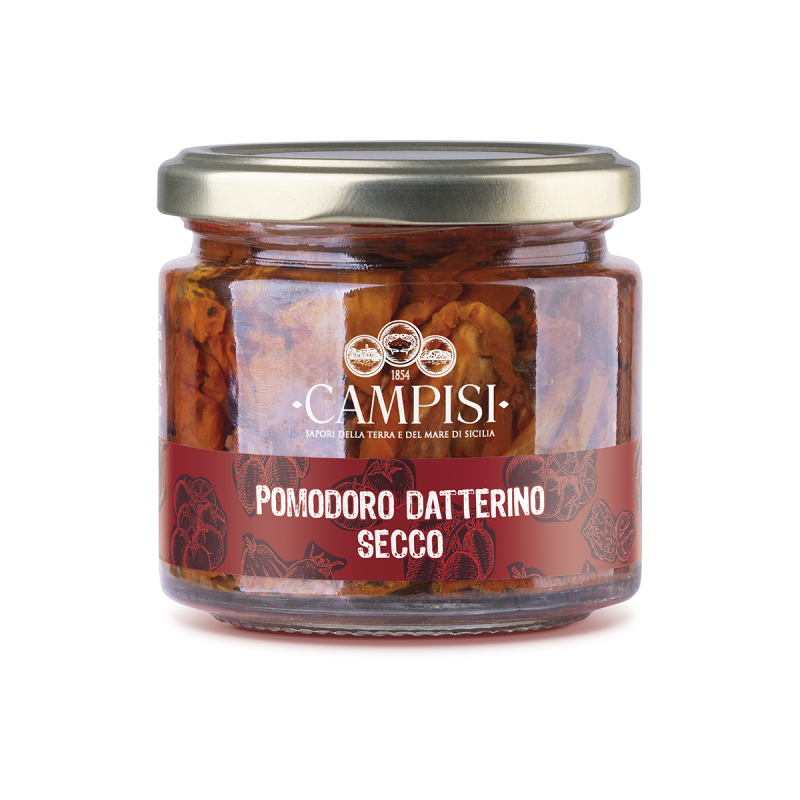 Campisi Sun-Dried Datterino Tomatoes are a Sicilian artisanal delicacy — carefully selected, salted, and sun-dried following ancient tradition, then preserved in olive oil. An explosion of aroma and flavor, perfect for enjoying on bruschetta, tartines, focaccia or flatbreads.